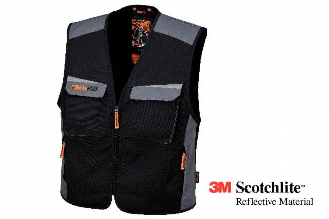 • Tascone al petto con chiusura a strappo e tiretto in nastro bicolore, taschini porta minuteria e taschino porta telefono con tiretto in nastro bicolore
